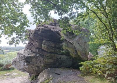- Optional Detour – Winnie the Pooh. Gills Lap is thought to be the setting for the Winnie the Pooh books. For lovers of AA Milne’s classic books, near here are the infamous Heffalump Trap, the Enchanted Place, and Roo’s Sandpit. Rather than turning L, walk along the ridge. On the R you will soon come to a clump of Pines – the Enchanted Place. Looking NW from there you will see a tree with a wide canopy protruding from the heathland. This is the Heffalump Trap. Carrying on along the ridge, on the R is a small quarry area which is the inspiration for Roo’s Sandpit. A little further on you come to a fenced area where you will find the AA Milne Memorial, with a beautiful view N.