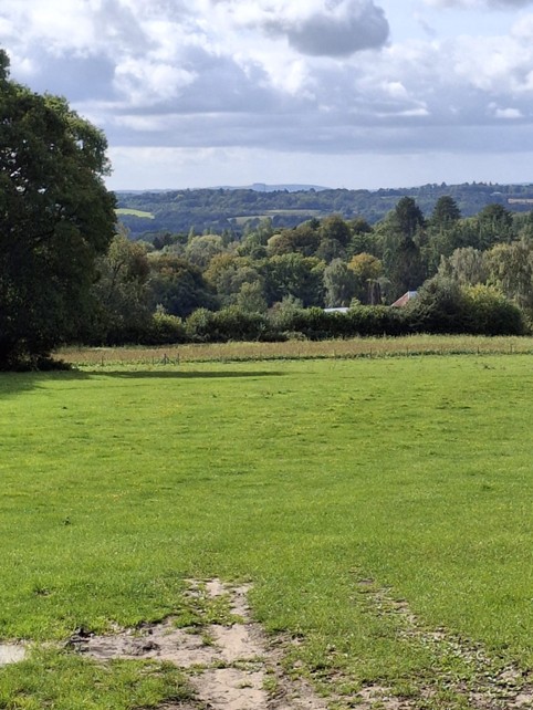 - Ignore BW turning L and follow FP and signs for Brambletye Barn South. Climb gently past farm on R. Look out for FP on L and follow down through a shaw with hazel and holly, and cross a footbridge. Keep R across field to cross a second footbridge and then follow narrow FP, muddy after rain. Follow FP uphill. Take a moment to look at the view, with East Grinstead church in the distance and orchards, woodland and shaws, a classic Sussex landscape.