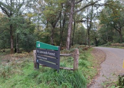 - Reach Old Copse Grouse Road, go straight across and follow FP down through pine woods to new bridge in St Leonards Forest. The Forest was used for hunting, and iron and charcoal production, stone quarrying, and raising rabbits. The woodland bird population is varied and it is home to rare purple emperor butterflies.